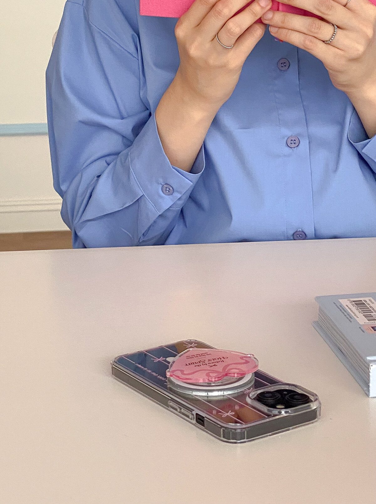 μ΄κ°λ ₯ μ μ°©νλ¦μΌλ‘ μΌμ΄μ€μ λΆμ°©νλ μΌλ° μ€λ§νΈν‘ μνμ ν‘μ (ν¬λͺ μ €νλ) μΌμ΄μ€μμ λΌμ΄λ΄μ€ λ μ μ°©λ©΄μ λμμΈμ΄ μΌλΆ λ²κ²¨μ§ μ μμ΅λλ€.